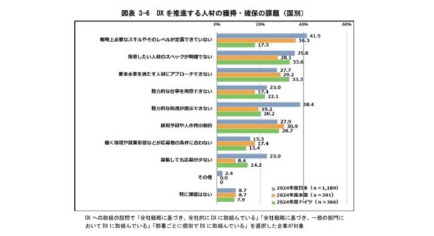 IPA(独立行政法人情報処理推進機構)の「DX動向2025」によると、DX人材の獲得・確保における課題として、「戦略上必要なスキルやレベルを定義できていない(41.5%)」「魅力的な処遇が提示できない(38.4%)」「採用したい人材のスペックが明確でない(35.8%)」が上位3項目に挙げられています。